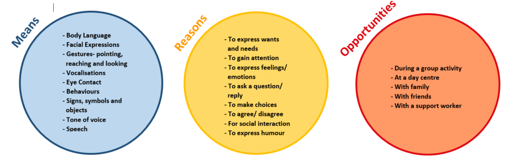 • All three are needed for functional communication. A breakdown can occur at any level, which can result in people not being able to express themselves, or they may communicate in a way which challenges others.